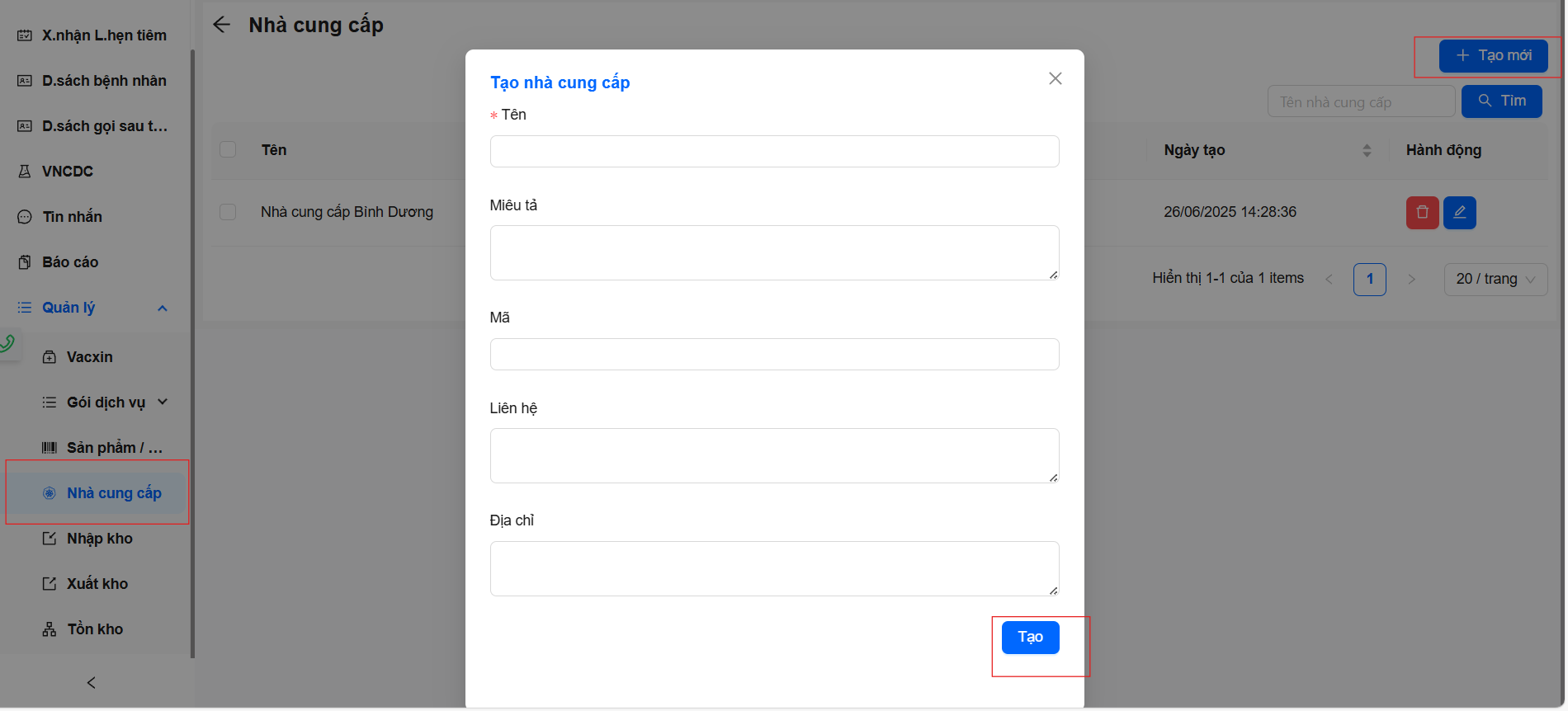 Tính năng Quản lý nhà cung cấp giúp bạn tạo và quản lý thông tin các nhà cung cấp vắc xin, thuốc, vật tư,... dùng để lập phiếu nhập hàng trong hệ thống.