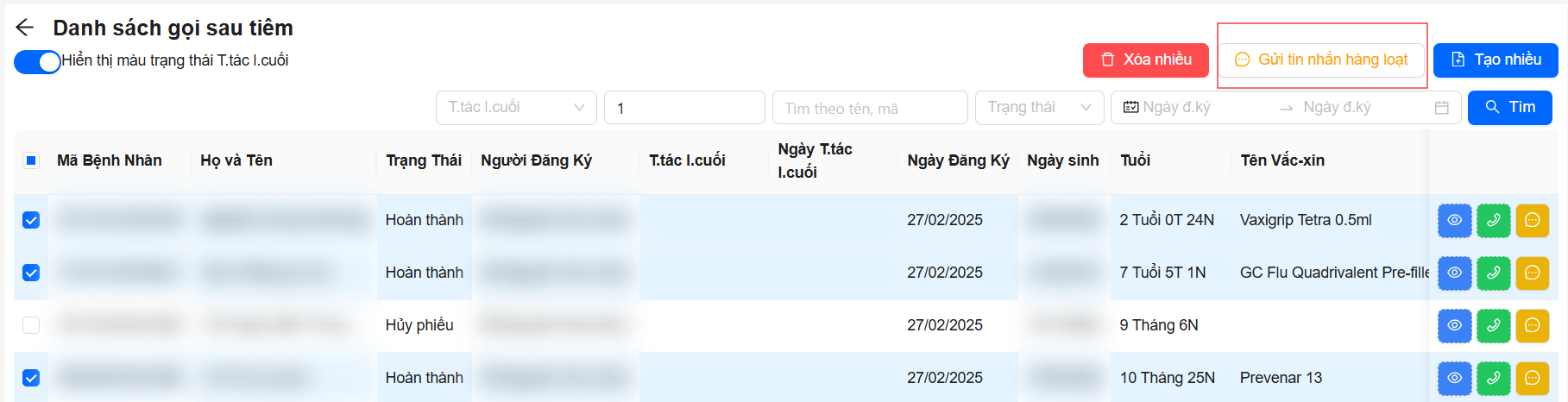 - Trên màn hình danh sách gọi sau tiêm, tick chọn các bệnh nhân mà bạn muốn gửi tin nhắn.