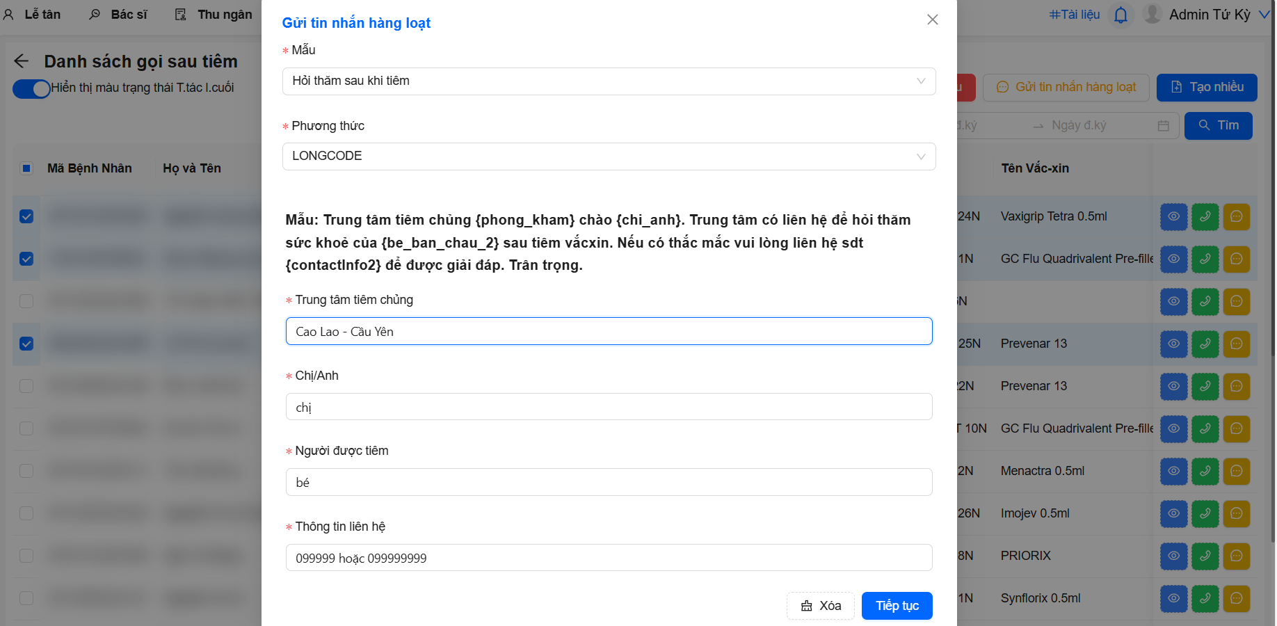 - Chọn mẫu tin nhắn phù hợp với mục đích (ví dụ: nhắc lịch tiêm, xác nhận lịch hẹn, chăm sóc sau tiêm...).