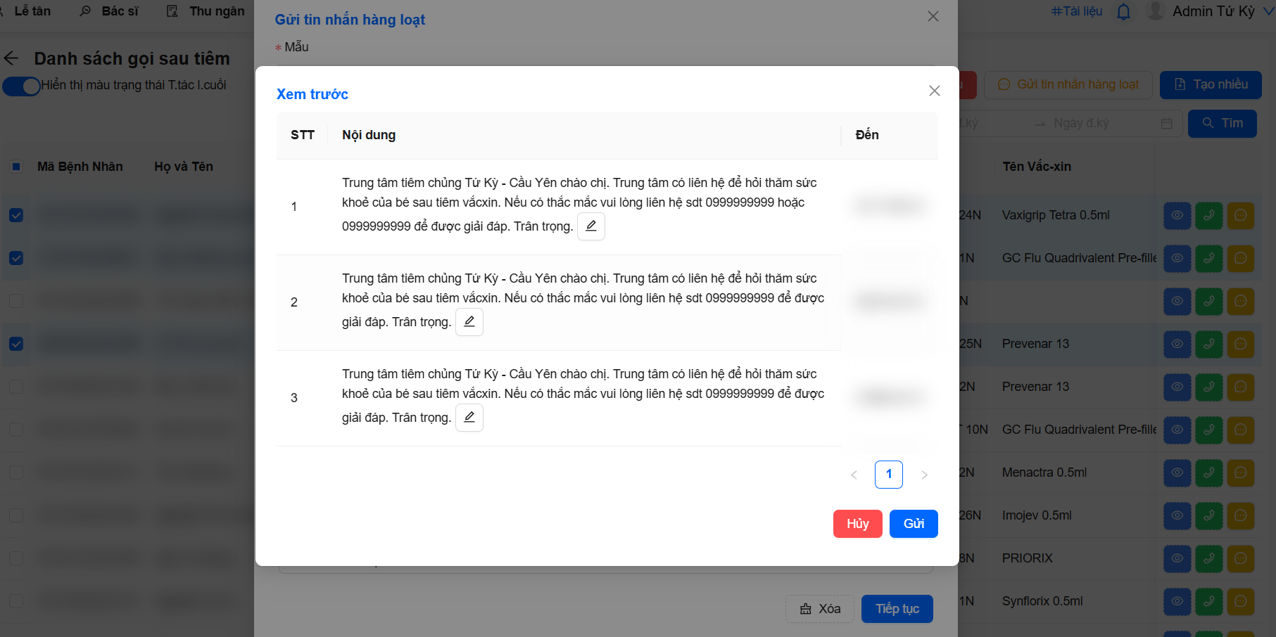 - Khi đã kiểm tra xong, nhấn Gửi để hệ thống tiến hành gửi tin nhắn hàng loạt tới bệnh nhân.