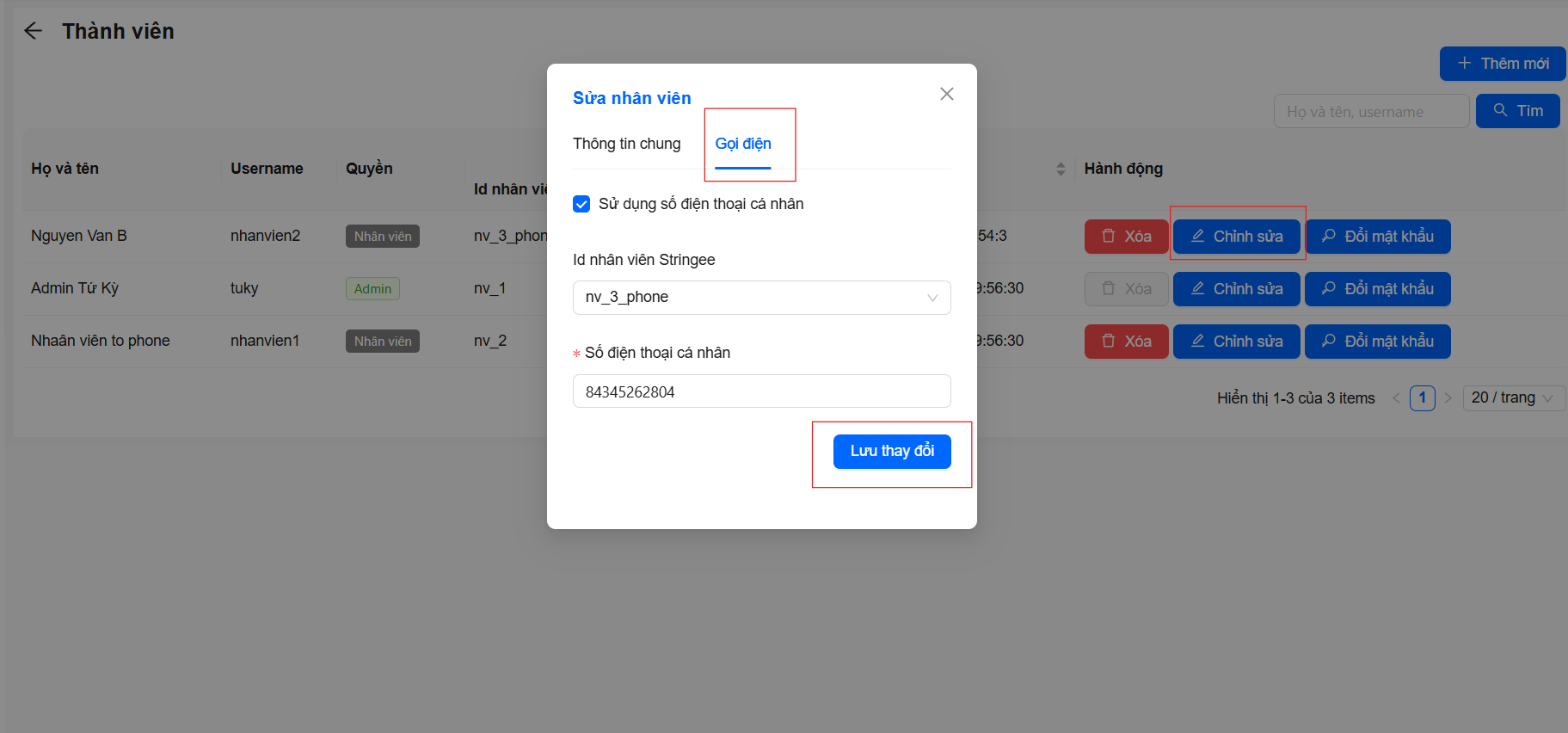 Tính năng này hỗ trợ phân quyền, thiết lập thông tin làm việc, cũng như cấu hình tổng đài cuộc gọi cho từng nhân sự.