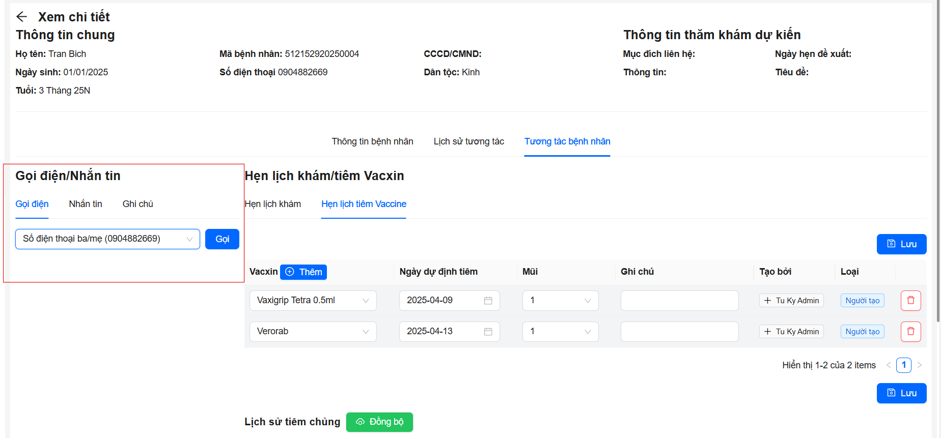 - Hệ thống sẽ tự động ghi nhận cuộc gọi vào lịch sử tương tác với bệnh nhân nếu thông tin được đồng bộ đúng.